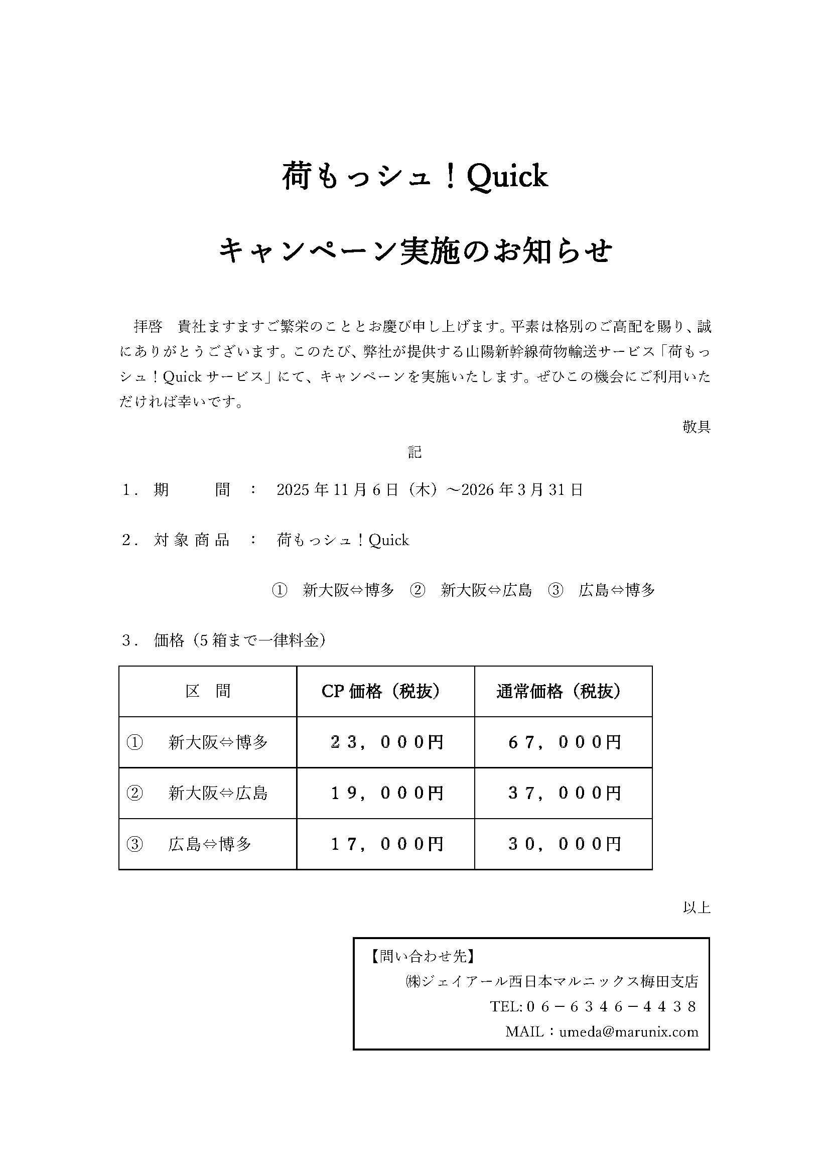 荷もっシュ!Quickキャンペーン実施のお知らせ